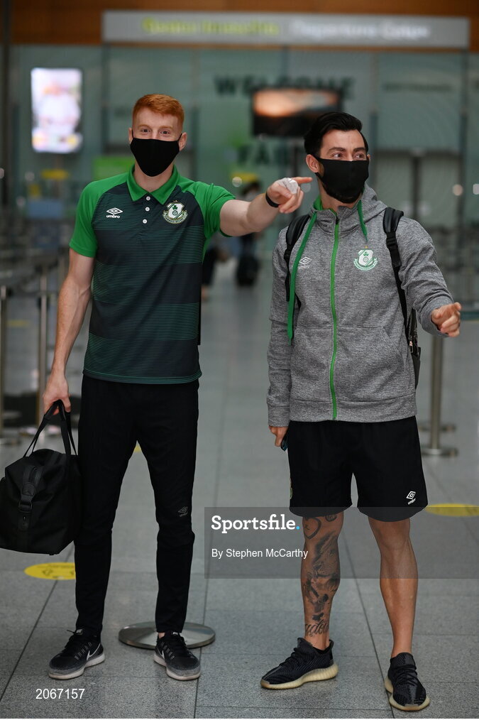 18 August 2021; Shamrock Rovers players Rory Gaffney, left, and Richie Towell at Dublin Airport prior to their team's departure to Estonia for their UEFA Europa Conference League Play-Off First Leg match against Flora Tallinn. Photo by Stephen McCarthy/Sportsfile