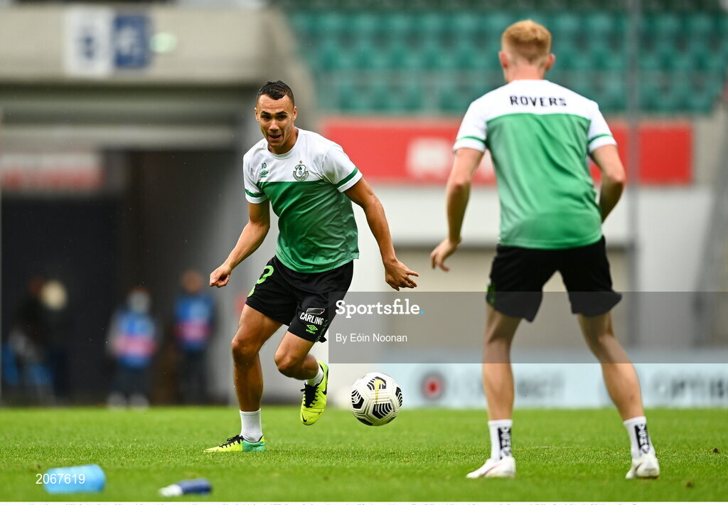 19 August 2021; Graham Burke of Shamrock Rovers, left, warms up with team-mate Liam Scale before the UEFA Europa Conference League play-off first leg match between Flora Tallinn and Shamrock Rovers at A. Le Coq Arena in Tallinn, Estonia Photo by Eóin Noonan/Sportsfile