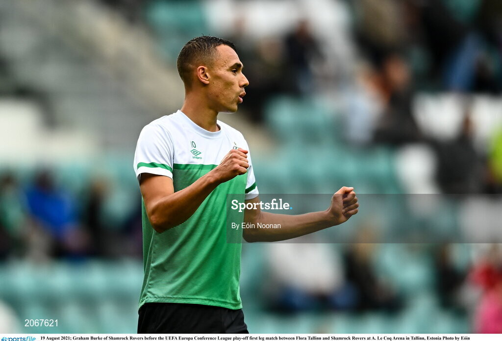 19 August 2021; Graham Burke of Shamrock Rovers before the UEFA Europa Conference League play-off first leg match between Flora Tallinn and Shamrock Rovers at A. Le Coq Arena in Tallinn, Estonia Photo by Eóin Noonan/Sportsfile