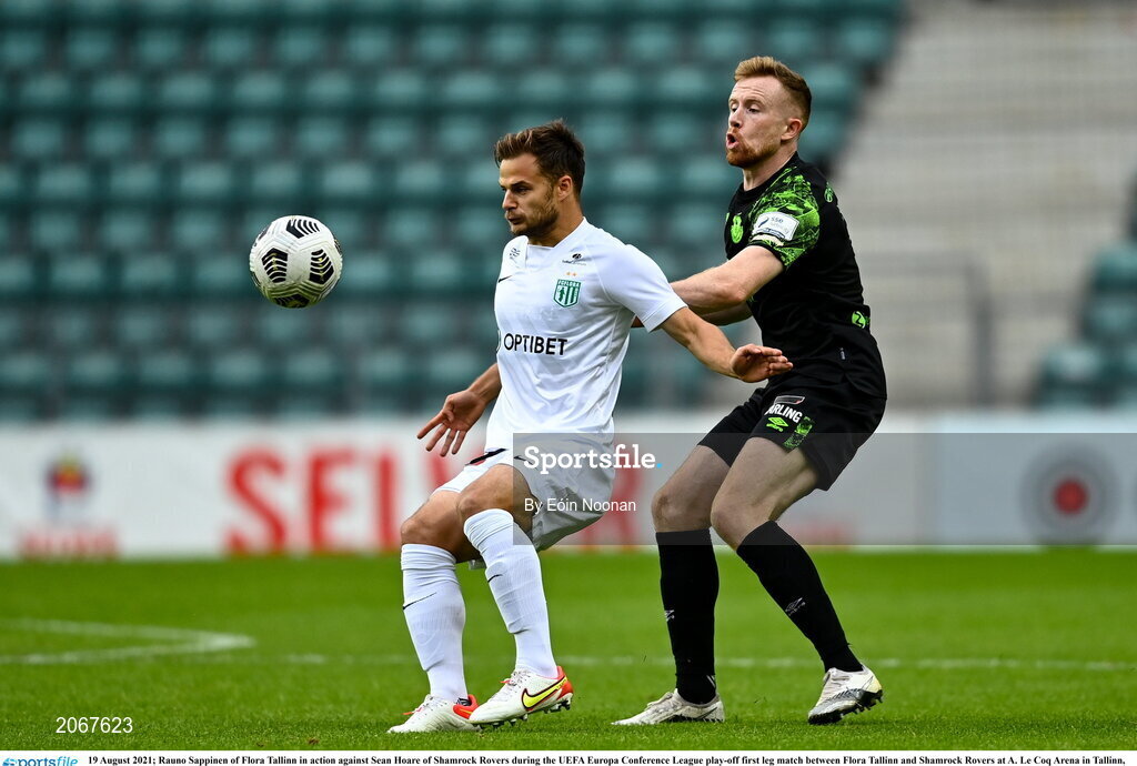 19 August 2021; Rauno Sappinen of Flora Tallinn in action against Sean Hoare of Shamrock Rovers during the UEFA Europa Conference League play-off first leg match between Flora Tallinn and Shamrock Rovers at A. Le Coq Arena in Tallinn, Estonia Photo by Eóin Noonan/Sportsfile