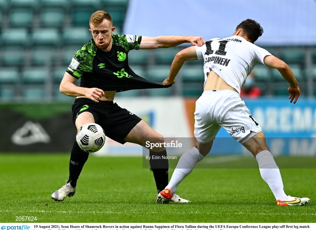 19 August 2021; Sean Hoare of Shamrock Rovers in action against Rauno Sappinen of Flora Tallinn during the UEFA Europa Conference League play-off first leg match between Flora Tallinn and Shamrock Rovers at A. Le Coq Arena in Tallinn, Estonia Photo by Eóin Noonan/Sportsfile