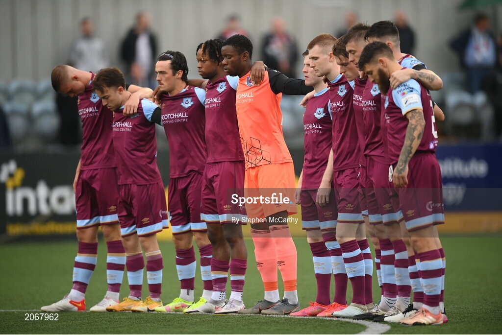 20 August 2021; Drogheda United players stand for a moment's silence in memory of the late Drogheda United coach David Conroy, who passed away on Thursday following a tragic accident, prior to the SSE Airtricity League Premier Division match between Dundalk and Drogheda United at Oriel Park in Dundalk, Louth. Photo by Stephen McCarthy/Sportsfile