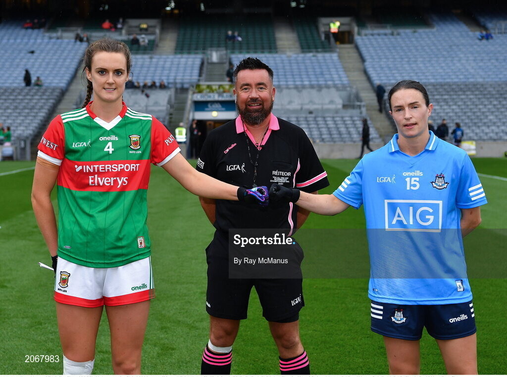 14 August 2021; Referee Séamus Mulvihill with the two captains, Clodagh McManamon of Mayo and Sinéad Aherne of Dublin, before the TG4 Ladies Football All-Ireland Championship semi-final match between Dublin and Mayo at Croke Park in Dublin. Photo by Ray McManus/Sportsfile