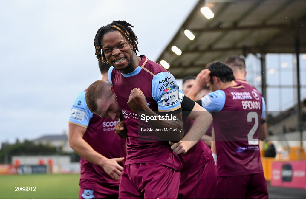 20 August 2021; Jordan Adeyemo of Drogheda United celebrates after team-mate Mark Doyle, left, scored their first goal during the SSE Airtricity League Premier Division match between Dundalk and Drogheda United at Oriel Park in Dundalk, Louth. Photo by Stephen McCarthy/Sportsfile