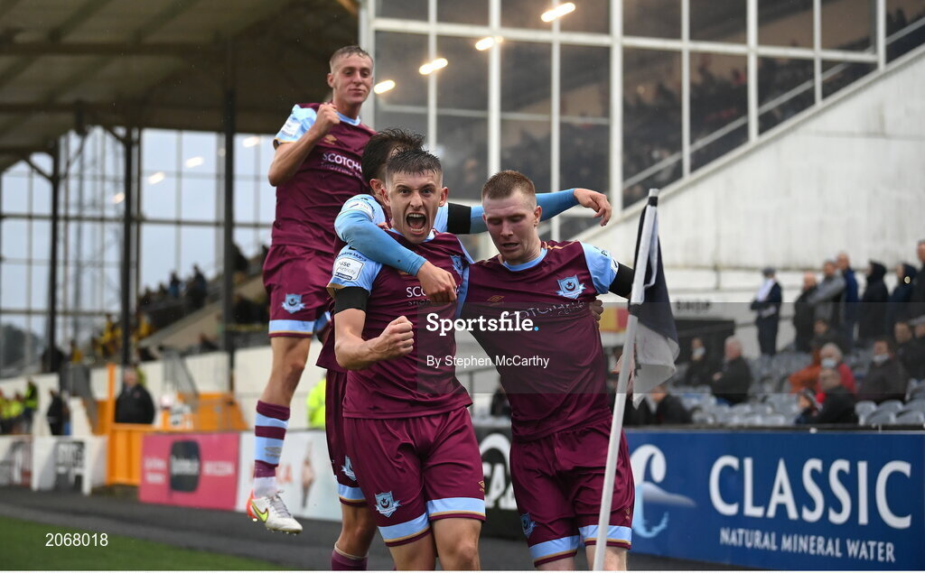 20 August 2021; Mark Doyle, right, celebrates with Drogheda United team-mates Jake Hyland, left, Darragh Markey, hidden, and Killian Phillips, back, during the SSE Airtricity League Premier Division match between Dundalk and Drogheda United at Oriel Park in Dundalk, Louth. Photo by Stephen McCarthy/Sportsfile