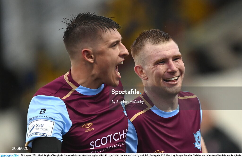 20 August 2021; Mark Doyle of Drogheda United celebrates after scoring his side's first goal with team-mate Jake Hyland, left, during the SSE Airtricity League Premier Division match between Dundalk and Drogheda United at Oriel Park in Dundalk, Louth. Photo by Stephen McCarthy/Sportsfile