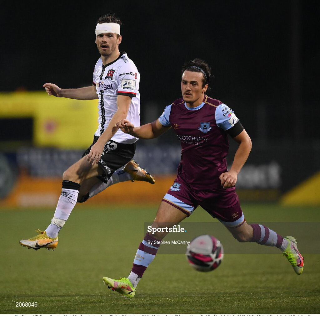 20 August 2021; Cameron Dummigan of Dundalk in action against James Brown of Drogheda United during the SSE Airtricity League Premier Division match between Dundalk and Drogheda United at Oriel Park in Dundalk, Louth. Photo by Stephen McCarthy/Sportsfile