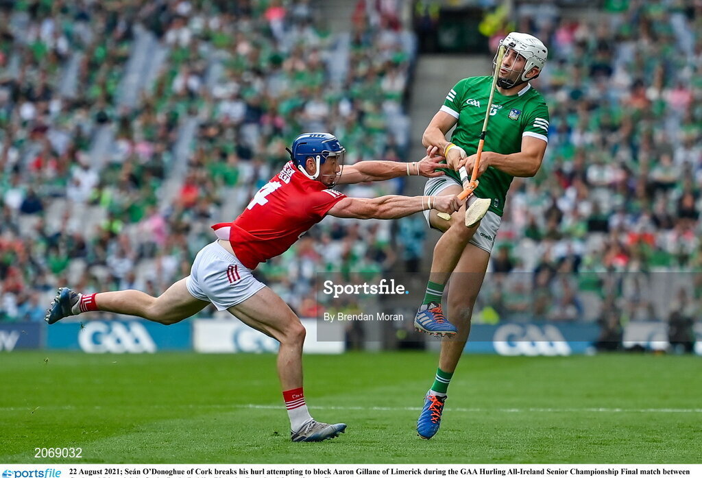 22 August 2021; Seán O’Donoghue of Cork breaks his hurl attempting to block Aaron Gillane of Limerick during the GAA Hurling All-Ireland Senior Championship Final match between Cork and Limerick in Croke Park, Dublin. Photo by Brendan Moran/Sportsfile