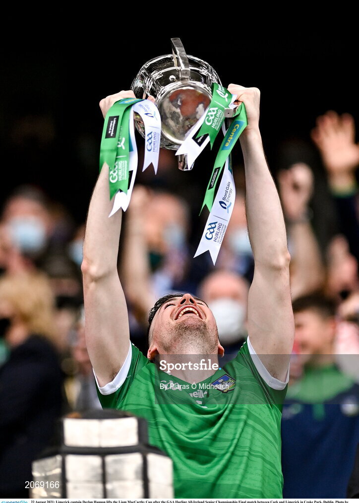 22 August 2021; Limerick captain Declan Hannon lifts the Liam MacCarthy Cup after the GAA Hurling All-Ireland Senior Championship Final match between Cork and Limerick in Croke Park, Dublin. Photo by Piaras Ó Mídheach/Sportsfile
