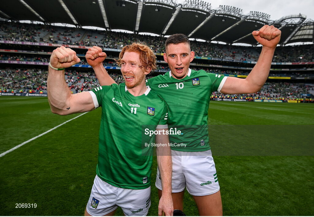 22 August 2021; Gearóid Hegarty, right, and Cian Lynch of Limerick celebrate after the GAA Hurling All-Ireland Senior Championship Final match between Cork and Limerick in Croke Park, Dublin. Photo by Stephen McCarthy/Sportsfile