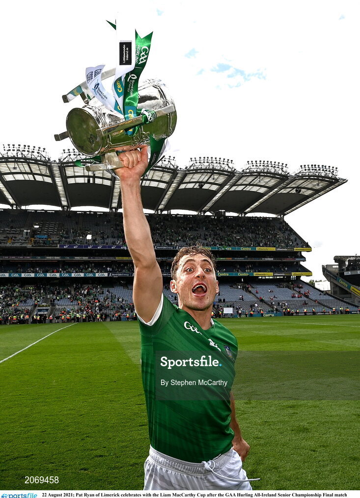22 August 2021; Pat Ryan of Limerick celebrates with the Liam MacCarthy Cup after the GAA Hurling All-Ireland Senior Championship Final match between Cork and Limerick in Croke Park, Dublin. Photo by Stephen McCarthy/Sportsfile