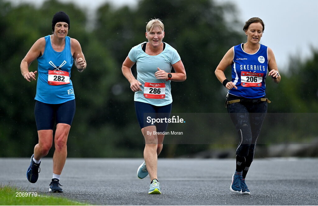 21 August 2021; Edel Quinn, left, and Anne Tormey of Garristown Flyers AC, Dublin, and Maeve Hegarty of Sherries AC, Dublin, competing in the Irish National 50 kilometre and 100 kilometre Championships, incorporating the Anglo Celtic Plate, at Mondello Park in Naas, Kildare. Photo by Brendan Moran/Sportsfile