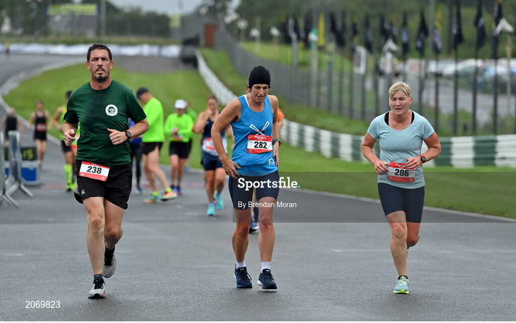 21 August 2021; Peter O'Toole of Newbridge AC, Kildare, left, Edel Quinn and Anne Tormey of Garristown Flyers AC, Dublin, competing in the Irish National 50 kilometre and 100 kilometre Championships, incorporating the Anglo Celtic Plate, at Mondello Park in Naas, Kildare. Photo by Brendan Moran/Sportsfile
