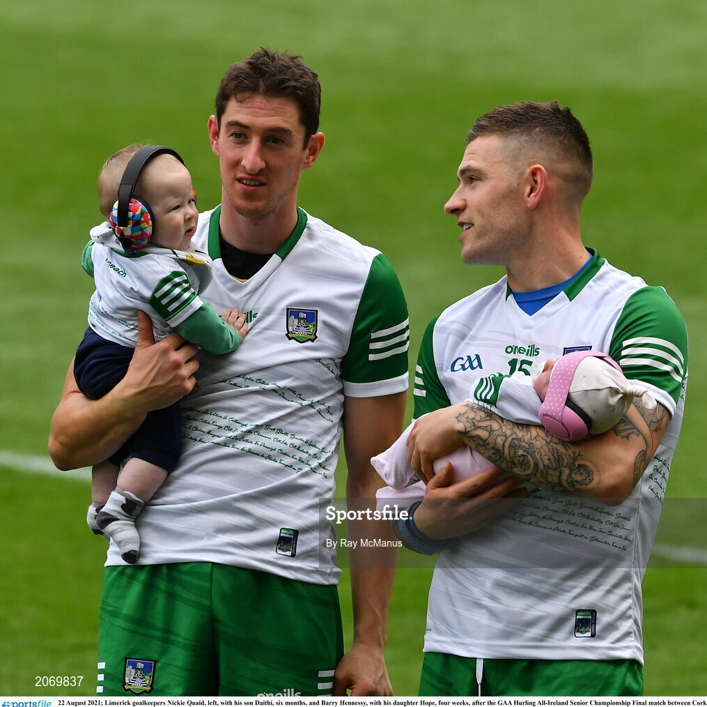 22 August 2021; Limerick goalkeepers Nickie Quaid, left, with his son Daithi, six months, and Barry Hennessy, with his daughter Hope, four weeks, after the GAA Hurling All-Ireland Senior Championship Final match between Cork and Limerick in Croke Park, Dublin. Photo by Ray McManus/Sportsfile
