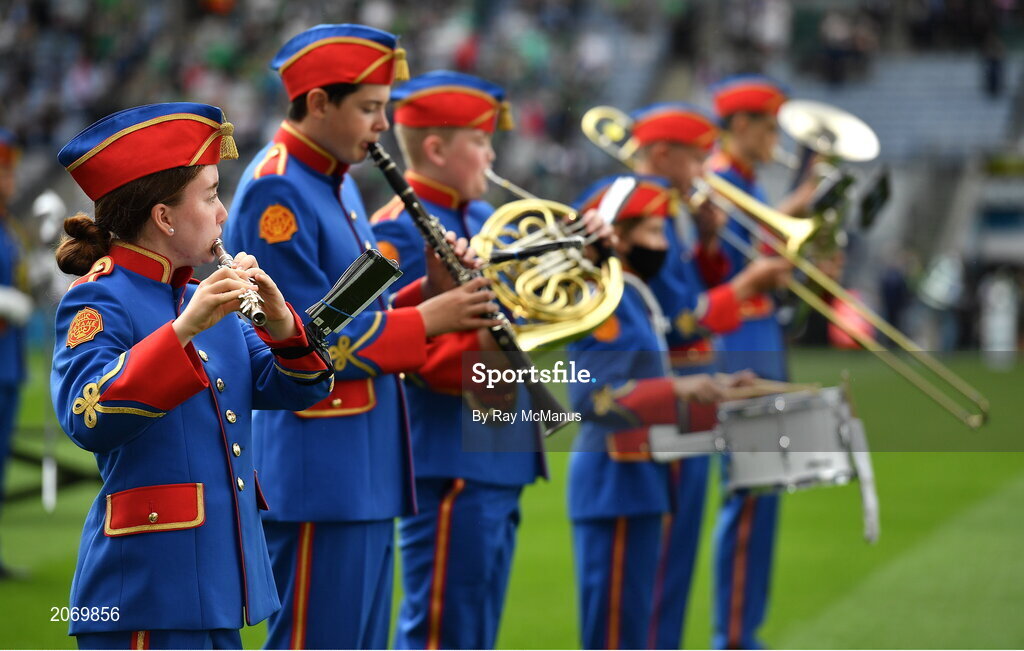 22 August 2021; Members of the Artane Band play before the GAA Hurling All-Ireland Senior Championship Final match between Cork and Limerick in Croke Park, Dublin. Photo by Ray McManus/Sportsfile