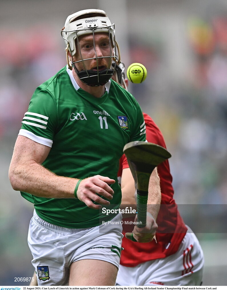 22 August 2021; Cian Lynch of Limerick in action against Mark Coleman of Cork during the GAA Hurling All-Ireland Senior Championship Final match between Cork and Limerick in Croke Park, Dublin. Photo by Piaras Ó Mídheach/Sportsfile