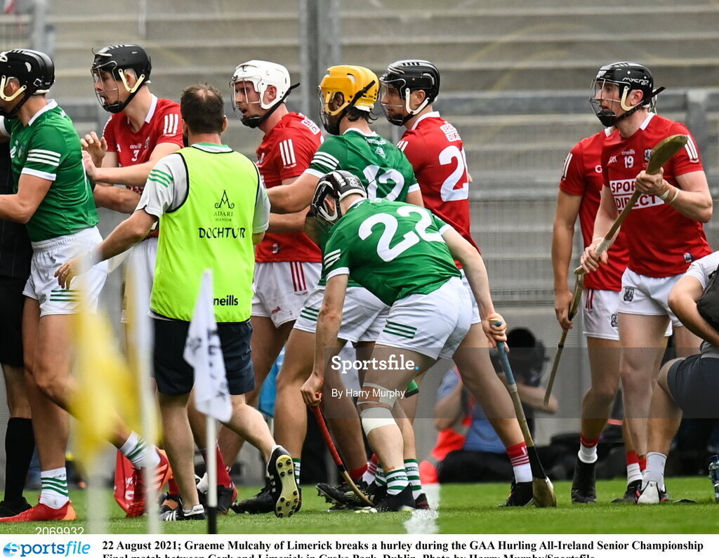 22 August 2021; Graeme Mulcahy of Limerick breaks a hurley during the GAA Hurling All-Ireland Senior Championship Final match between Cork and Limerick in Croke Park, Dublin. Photo by Harry Murphy/Sportsfile