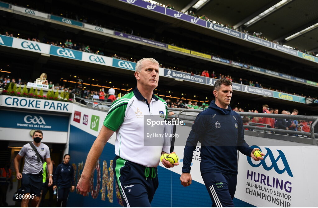 22 August 2021; Limerick manager John Kiely walks out with selector Donal O'Grady before the GAA Hurling All-Ireland Senior Championship Final match between Cork and Limerick in Croke Park, Dublin. Photo by Harry Murphy/Sportsfile