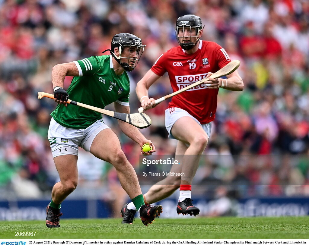 22 August 2021; Darragh O’Donovan of Limerick in action against Damien Cahalane of Cork during the GAA Hurling All-Ireland Senior Championship Final match between Cork and Limerick in Croke Park, Dublin. Photo by Piaras Ó Mídheach/Sportsfile