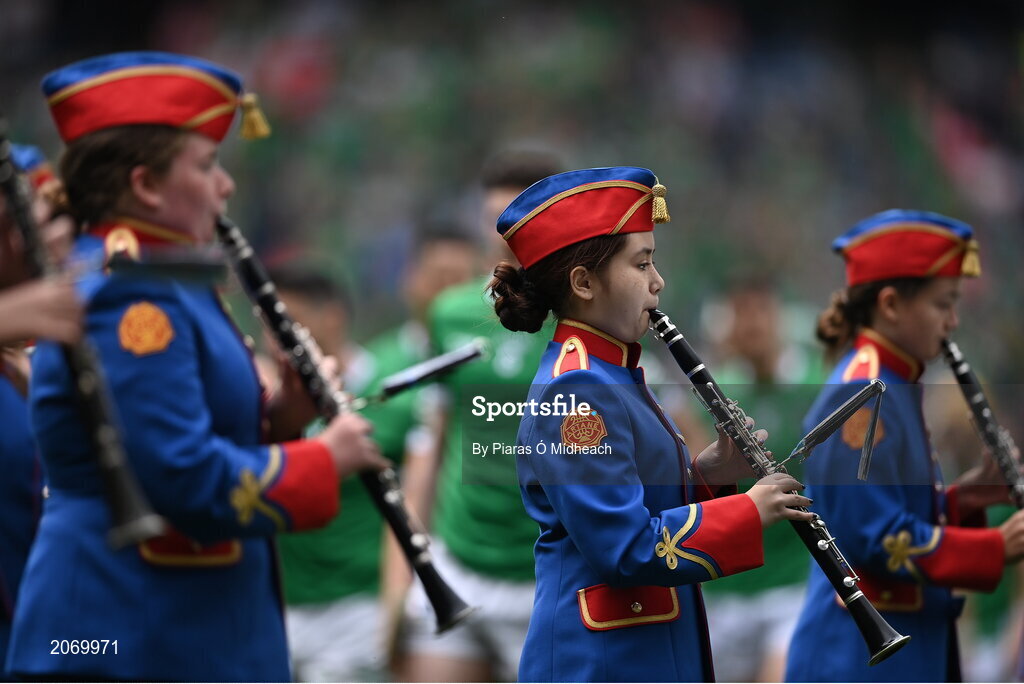 22 August 2021; A member of the Artane School of Music Band in the parade before the GAA Hurling All-Ireland Senior Championship Final match between Cork and Limerick in Croke Park, Dublin. Photo by Piaras Ó Mídheach/Sportsfile