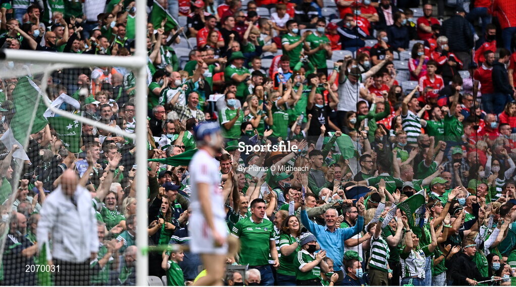 22 August 2021; Limerick supporters celebrate their side's third goal, scored by Gearóid Hegarty, during the GAA Hurling All-Ireland Senior Championship Final match between Cork and Limerick in Croke Park, Dublin. Photo by Piaras Ó Mídheach/Sportsfile