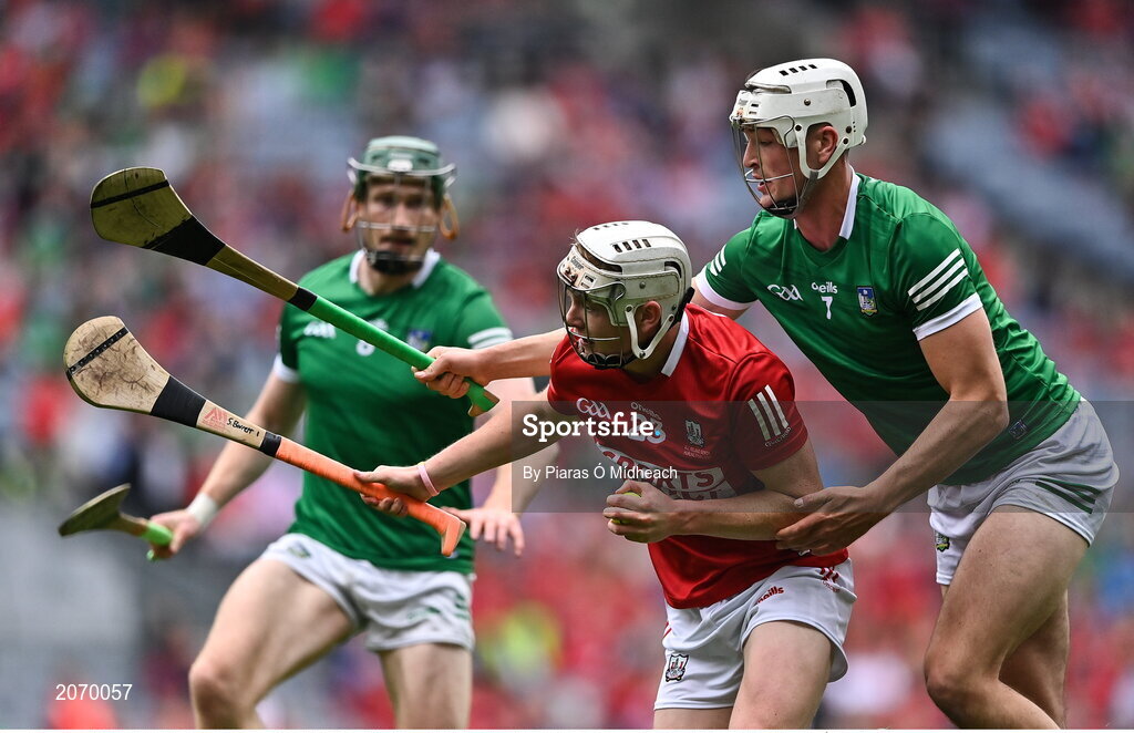 22 August 2021; Shane Barrett of Cork in action against Kyle Hayes, right, and William O’Donoghue of Limerick during the GAA Hurling All-Ireland Senior Championship Final match between Cork and Limerick in Croke Park, Dublin. Photo by Piaras Ó Mídheach/Sportsfile