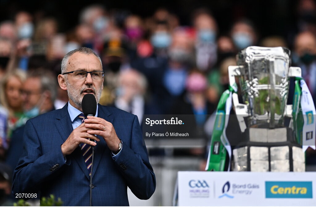 22 August 2021; Uachtarán Chumann Lúthchleas Gael Larry McCarthy makes a speech after the GAA Hurling All-Ireland Senior Championship Final match between Cork and Limerick in Croke Park, Dublin. Photo by Piaras Ó Mídheach/Sportsfile