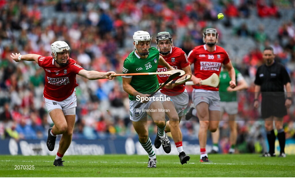 22 August 2021; Pat Ryan of Limerick is dispossessed by Luke Meade of Cork during the GAA Hurling All-Ireland Senior Championship Final match between Cork and Limerick in Croke Park, Dublin. Photo by Brendan Moran/Sportsfile
