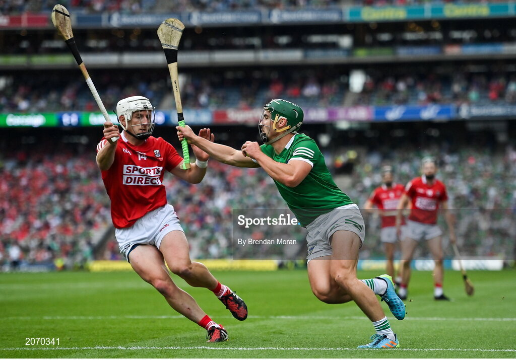 22 August 2021; Sean Finn of Limerick in action against Patrick Horgan of Cork during the GAA Hurling All-Ireland Senior Championship Final match between Cork and Limerick in Croke Park, Dublin. Photo by Brendan Moran/Sportsfile