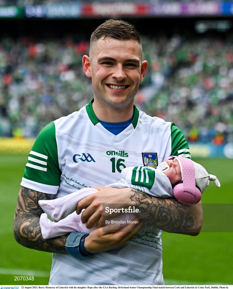 22 August 2021; Barry Hennessy of Limerick with his daughter Hope after the GAA Hurling All-Ireland Senior Championship Final match between Cork and Limerick in Croke Park, Dublin. Photo by Brendan Moran/Sportsfile