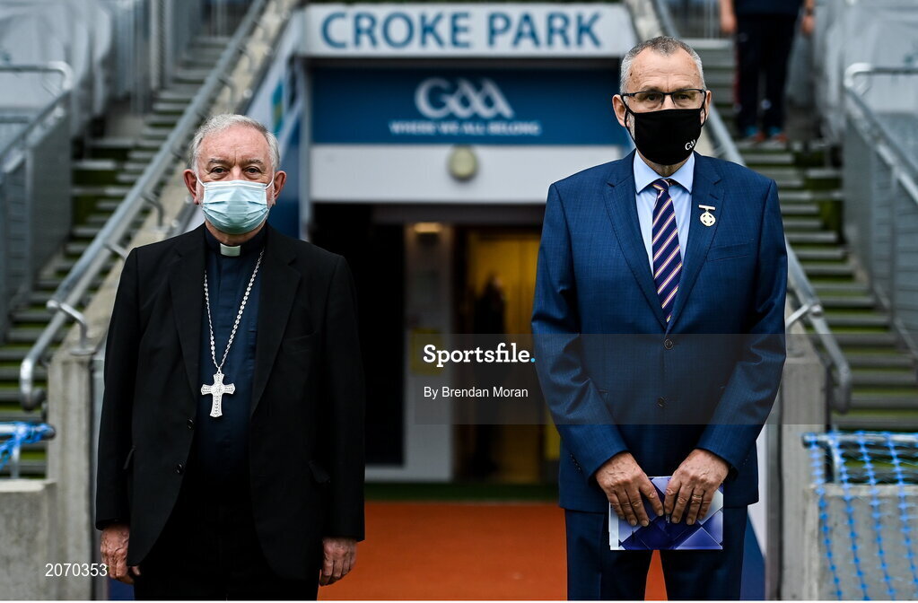 22 August 2021; Patron of the GAA, Bishop of Cashel and Emly Kieran O'Reilly and Uachtarán Chumann Lúthchleas Gael Larry McCarthy are introduced before the GAA Hurling All-Ireland Senior Championship Final match between Cork and Limerick in Croke Park, Dublin. Photo by Brendan Moran/Sportsfile