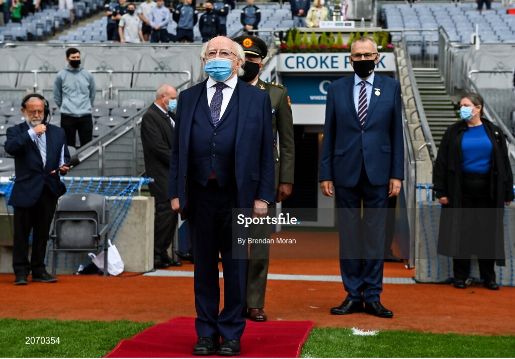 22 August 2021; President of Ireland Michael D Higgins and Uachtarán Chumann Lúthchleas Gael Larry McCarthy arrive before the GAA Hurling All-Ireland Senior Championship Final match between Cork and Limerick in Croke Park, Dublin. Photo by Brendan Moran/Sportsfile Photo by Brendan Moran/Sportsfile
