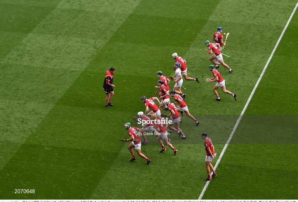 22 August 2021; Cork Strength and Conditioning coach Mark Brady conducts the warm-up ahead of the GAA Hurling All-Ireland Senior Championship Final match between Cork and Limerick in Croke Park, Dublin. Photo by Daire Brennan/Sportsfile
