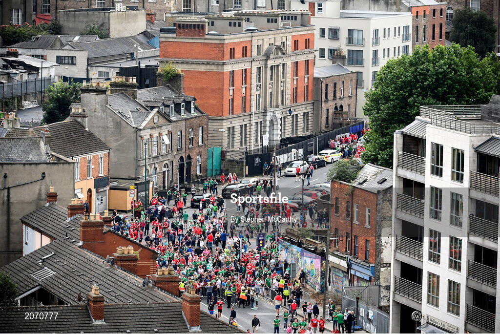 22 August 2021; Supporters arrive onto Jones' Road before the GAA Hurling All-Ireland Senior Championship Final match between Cork and Limerick in Croke Park, Dublin. Photo by Stephen McCarthy/Sportsfile