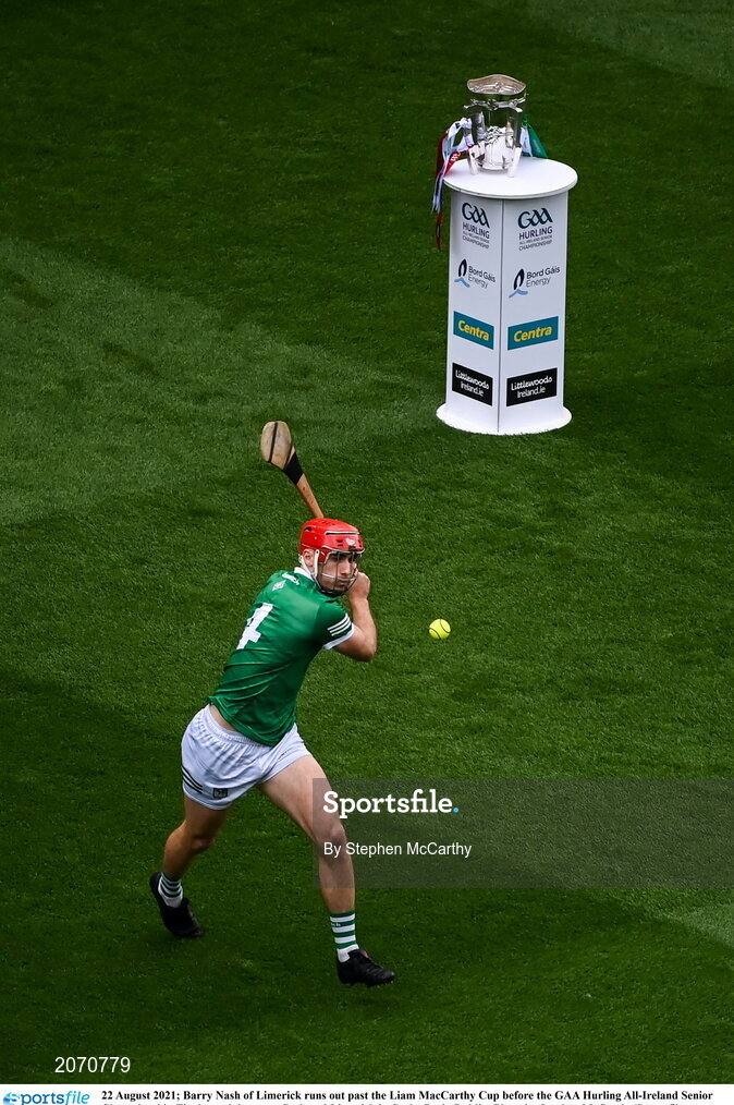 22 August 2021; Barry Nash of Limerick runs out past the Liam MacCarthy Cup before the GAA Hurling All-Ireland Senior Championship Final match between Cork and Limerick in Croke Park, Dublin. Photo by Stephen McCarthy/Sportsfile