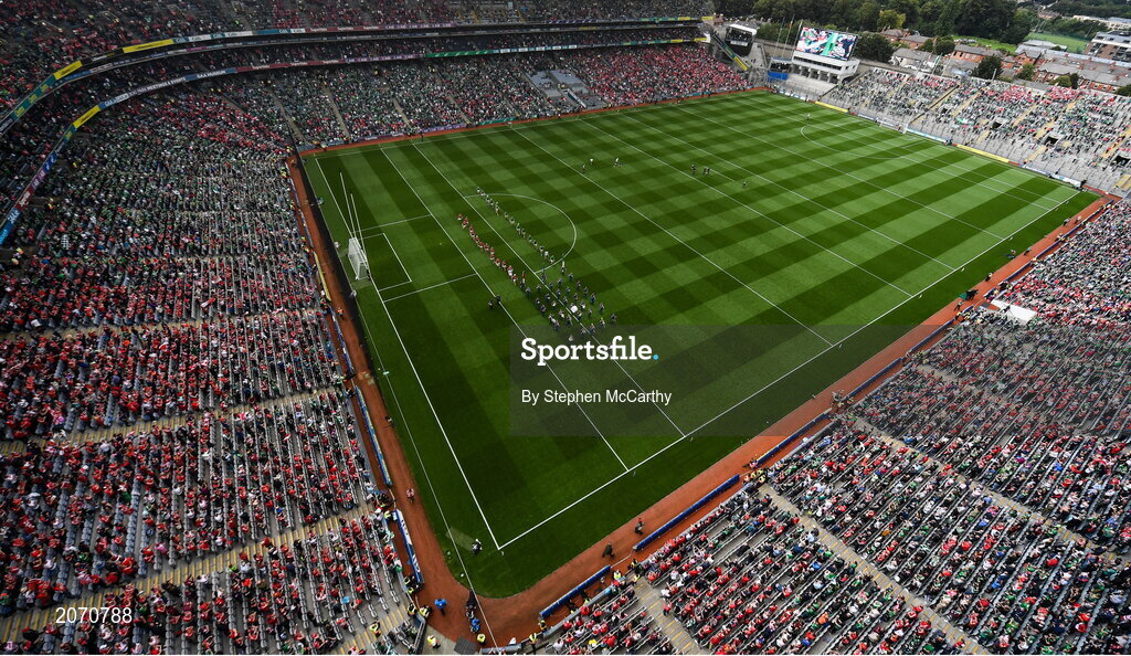 22 August 2021; A general view of Croke Park during the pre-match parade before the GAA Hurling All-Ireland Senior Championship Final match between Cork and Limerick in Croke Park, Dublin. Photo by Stephen McCarthy/Sportsfile