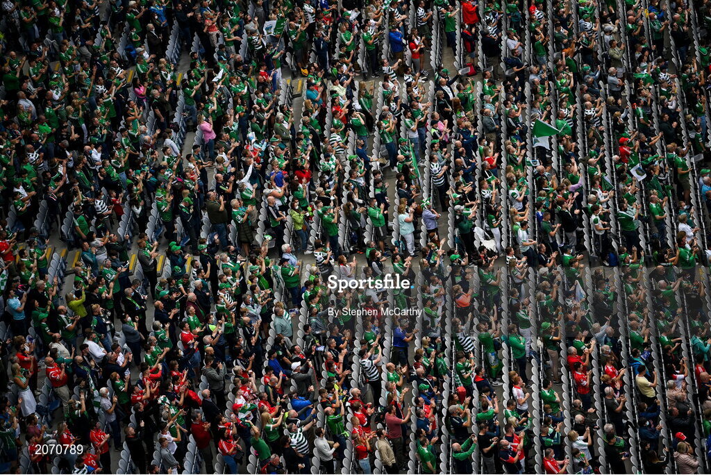 22 August 2021; Cork and Limerick supporters in the Canal End stand during the GAA Hurling All-Ireland Senior Championship Final match between Cork and Limerick in Croke Park, Dublin. Photo by Stephen McCarthy/Sportsfile