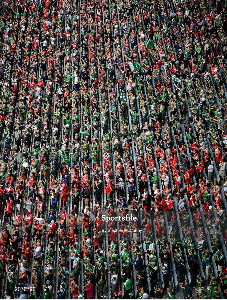 22 August 2021; Cork and Limerick supporters in the Cusack Stand before the GAA Hurling All-Ireland Senior Championship Final match between Cork and Limerick in Croke Park, Dublin. Photo by Stephen McCarthy/Sportsfile