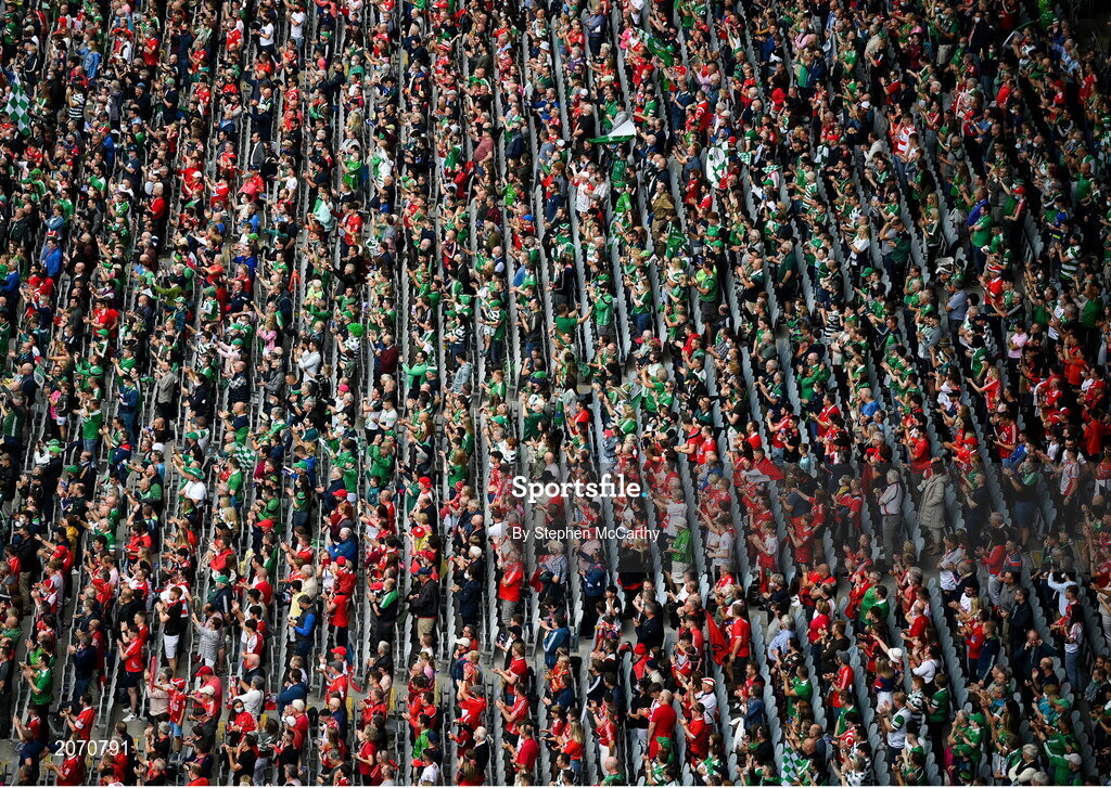 22 August 2021; Cork and Limerick supporters in the Cusack Stand before the GAA Hurling All-Ireland Senior Championship Final match between Cork and Limerick in Croke Park, Dublin. Photo by Stephen McCarthy/Sportsfile