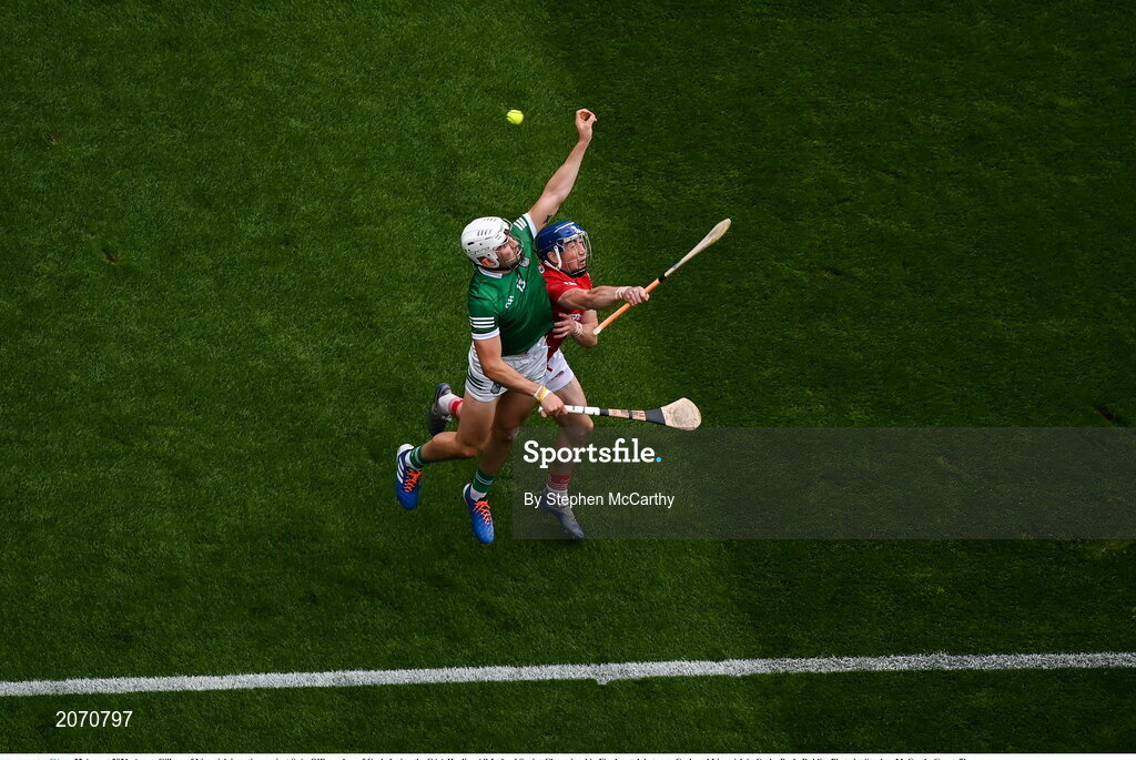 22 August 2021; Aaron Gillane of Limerick in action against Seán O’Donoghue of Cork during the GAA Hurling All-Ireland Senior Championship Final match between Cork and Limerick in Croke Park, Dublin. Photo by Stephen McCarthy/Sportsfile