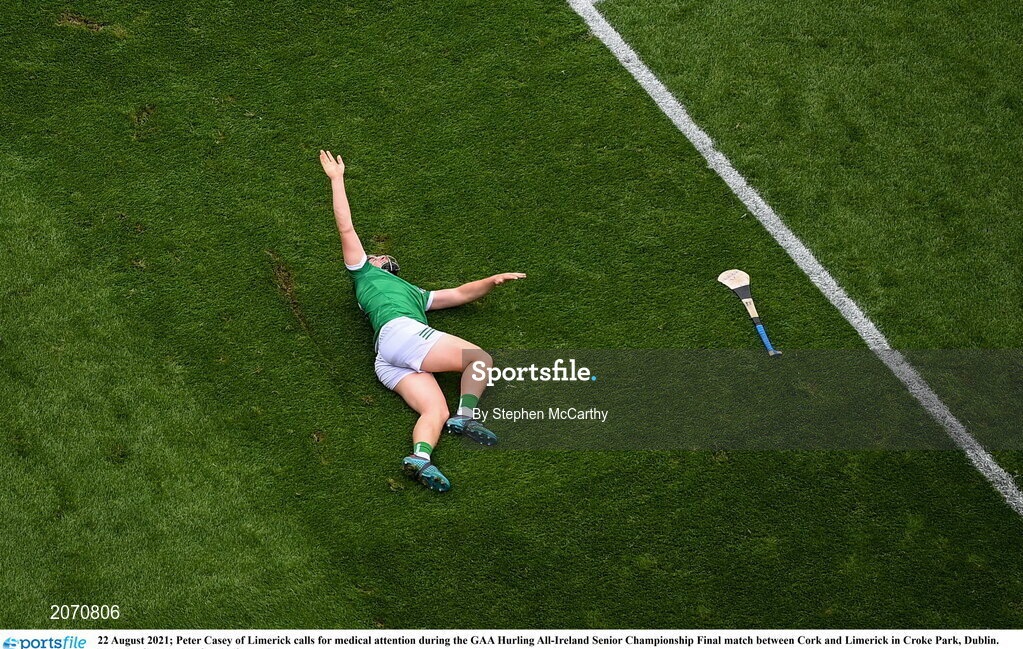22 August 2021; Peter Casey of Limerick calls for medical attention during the GAA Hurling All-Ireland Senior Championship Final match between Cork and Limerick in Croke Park, Dublin. Photo by Stephen McCarthy/Sportsfile