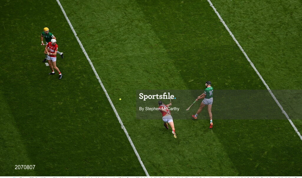 22 August 2021; Gearóid Hegarty of Limerick shoots to score his side's third goal, despite the attention of Robert Downey of Cork, during the GAA Hurling All-Ireland Senior Championship Final match between Cork and Limerick in Croke Park, Dublin. Photo by Stephen McCarthy/Sportsfile