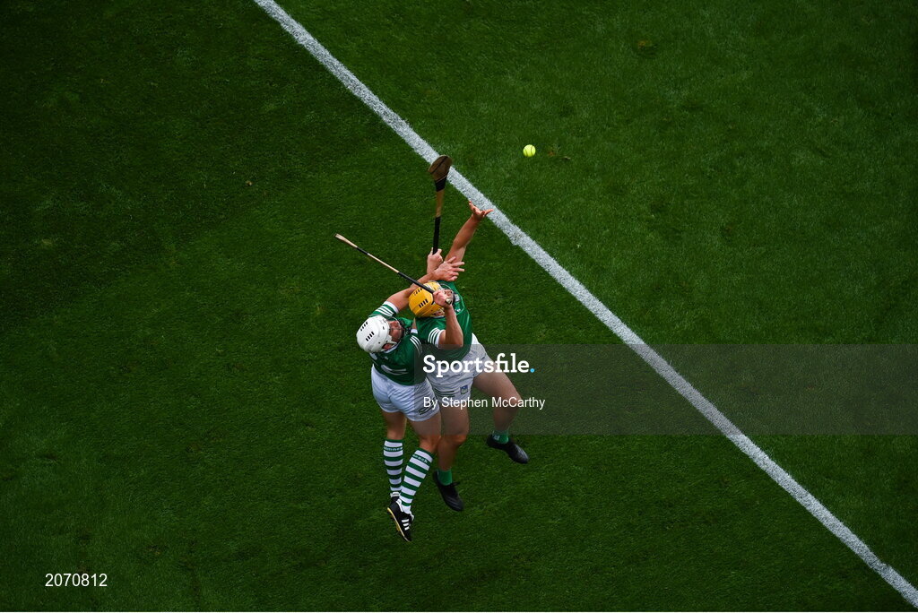 22 August 2021; Limerick players Cathal O’Neill and Pat Ryan, left, warm up before the GAA Hurling All-Ireland Senior Championship Final match between Cork and Limerick in Croke Park, Dublin. Photo by Stephen McCarthy/Sportsfile