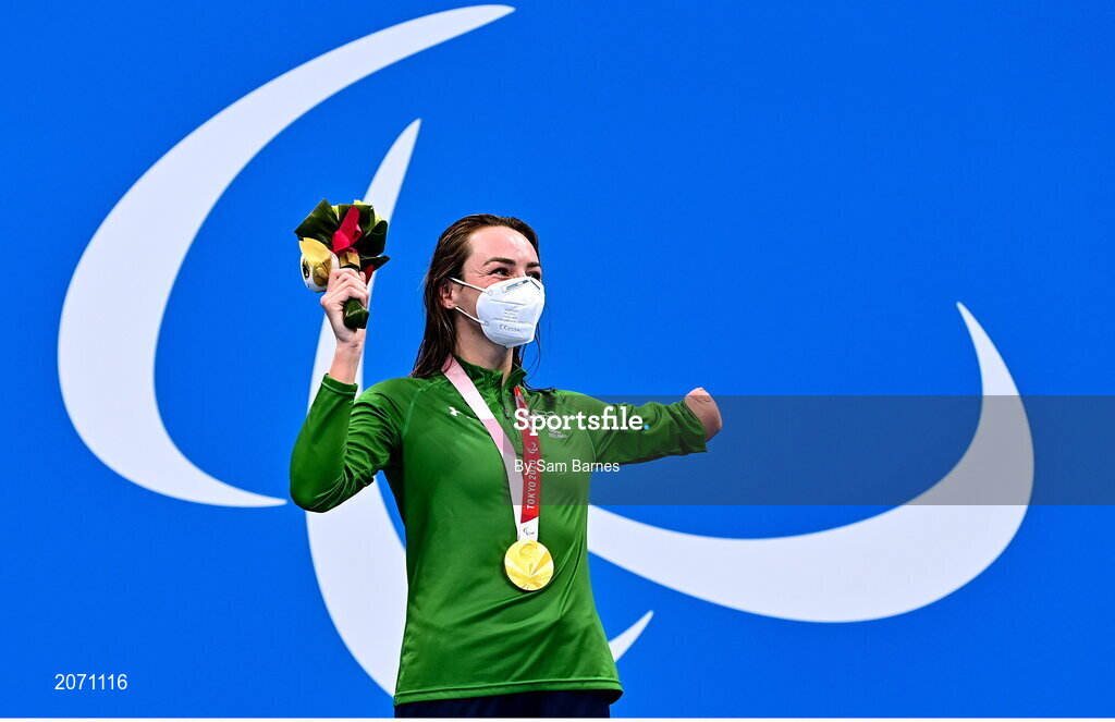 26 August 2021; Ellen Keane of Ireland looks up to her team-mates as she collects her gold medal after winning the Women's SB8 100 metre breaststroke final at the Tokyo Aquatic Centre on day two during the Tokyo 2020 Paralympic Games in Tokyo, Japan. Photo by Sam Barnes/Sportsfile