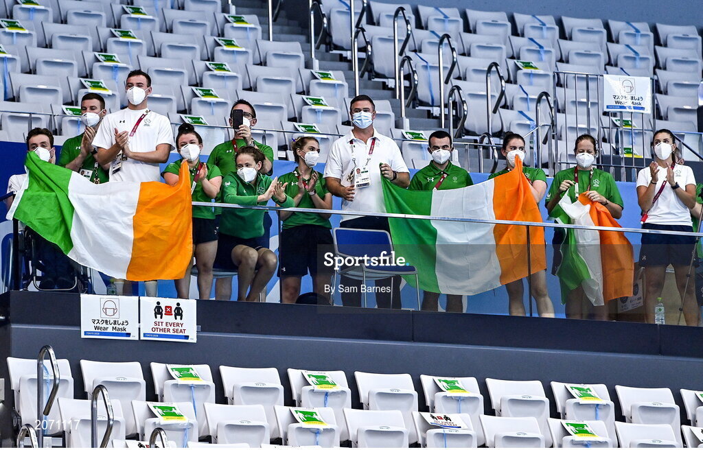 26 August 2021; The Ireland team cheer for Ellen Keane of Ireland as she collects her gold medal after winning in the Women's SB8 100 metre breaststroke final at the Tokyo Aquatic Centre on day two during the Tokyo 2020 Paralympic Games in Tokyo, Japan. Photo by Sam Barnes/Sportsfile