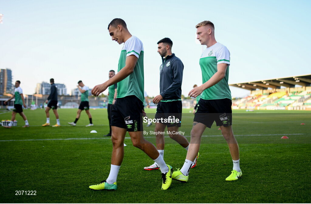 26 August 2021; Shamrock Rovers players, from left, Graham Burke, Danny Mandroiu and Liam Scales before the UEFA Europa Conference League play-off second leg match between Shamrock Rovers and Flora Tallinn at Tallaght Stadium in Dublin. Photo by Stephen McCarthy/Sportsfile