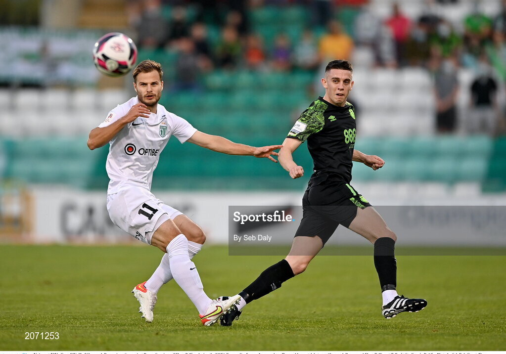 26 August 2021; Gary O'Neill of Shamrock Rovers in action against Rauno Sappinen of Flora Tallinn during the UEFA Europa Conference League play-off second leg match between Shamrock Rovers and Flora Tallinn at Tallaght Stadium in Dublin. Photo by Seb Daly/Sportsfile