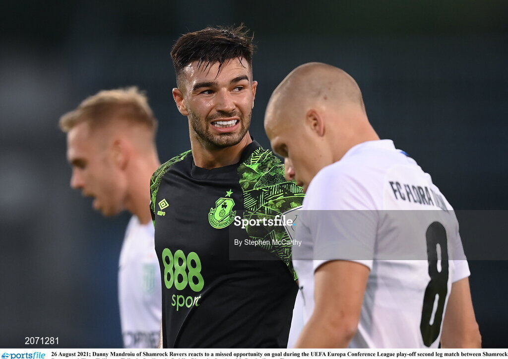 26 August 2021; Danny Mandroiu of Shamrock Rovers reacts to a missed opportunity on goal during the UEFA Europa Conference League play-off second leg match between Shamrock Rovers and Flora Tallinn at Tallaght Stadium in Dublin. Photo by Stephen McCarthy/Sportsfile