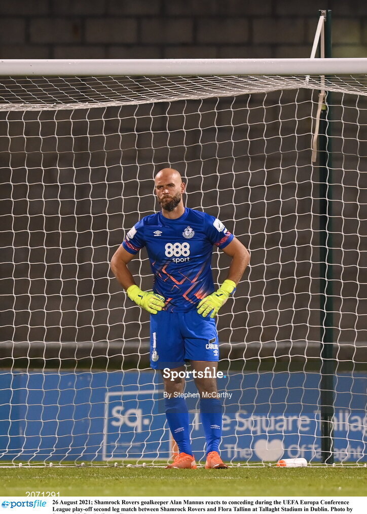 26 August 2021; Shamrock Rovers goalkeeper Alan Mannus reacts to conceding during the UEFA Europa Conference League play-off second leg match between Shamrock Rovers and Flora Tallinn at Tallaght Stadium in Dublin. Photo by Stephen McCarthy/Sportsfile