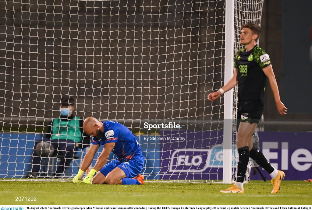 26 August 2021; Shamrock Rovers goalkeeper Alan Mannus and Sean Gannon after conceding during the UEFA Europa Conference League play-off second leg match between Shamrock Rovers and Flora Tallinn at Tallaght Stadium in Dublin. Photo by Stephen McCarthy/Sportsfile